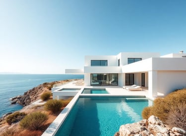 A coastal villa where indoor and outdoor spaces flow seamlessly. White-rendered walls and timber screens filter Mediterranean sunlight throughout the day.